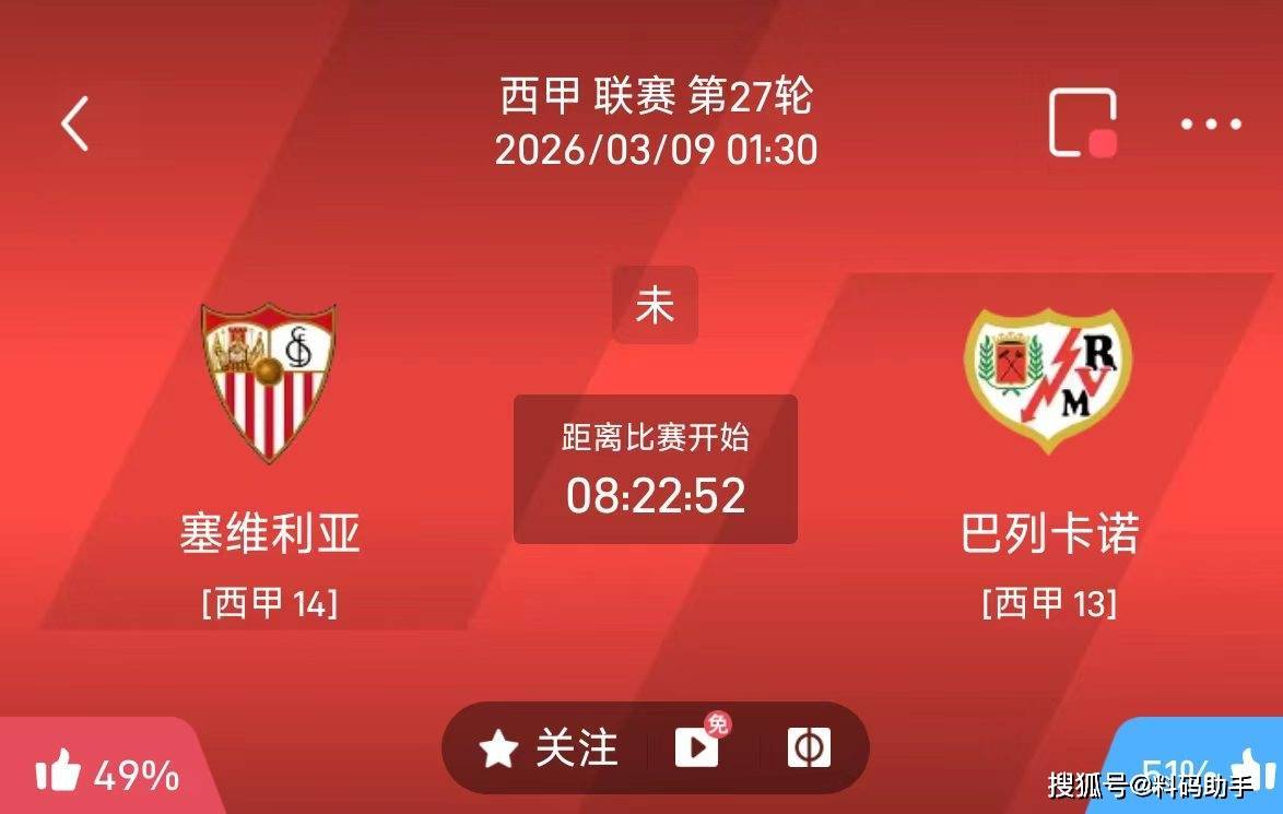 1点30西甲 塞维利亚VS巴列卡诺 主不败